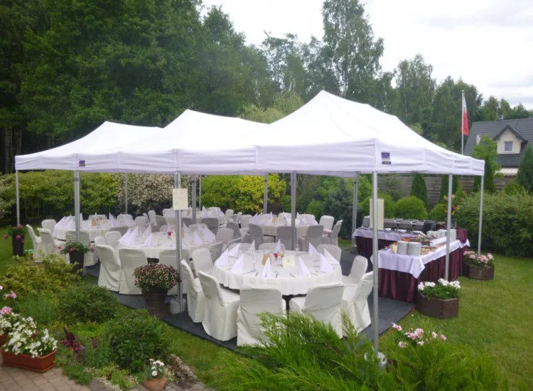 Oferujemy wynajem namiotów imprezowych i bankietowych na każdą okazję – jedną z najpopularniejszych opcji są namioty weselne. Dostępne są specjalne baldachimy, pod którymi może odbyć się ceremonia ślubu w plenerze – jest to obecnie coraz częściej wykorzystywana możliwość, pozwalająca na złożenie przysięgi w pięknych okolicznościach przyrody. Baldachimy są nie tylko stabilne i wytrzymałe, ale przede wszystkim dopasowane estetycznie do okazji – biały kolor i piękne zdobienia sprawiają, że można dzięki nim urządzić ślub marzeń. Ponadto można także skorzystać z namiotów o dużych powierzchniach, które pomieszczą wszystkich gości i urządzić wesele w plenerze, zapewniając przy tym ochronę przed słońcem czy ewentualnie kapryśną aurą.